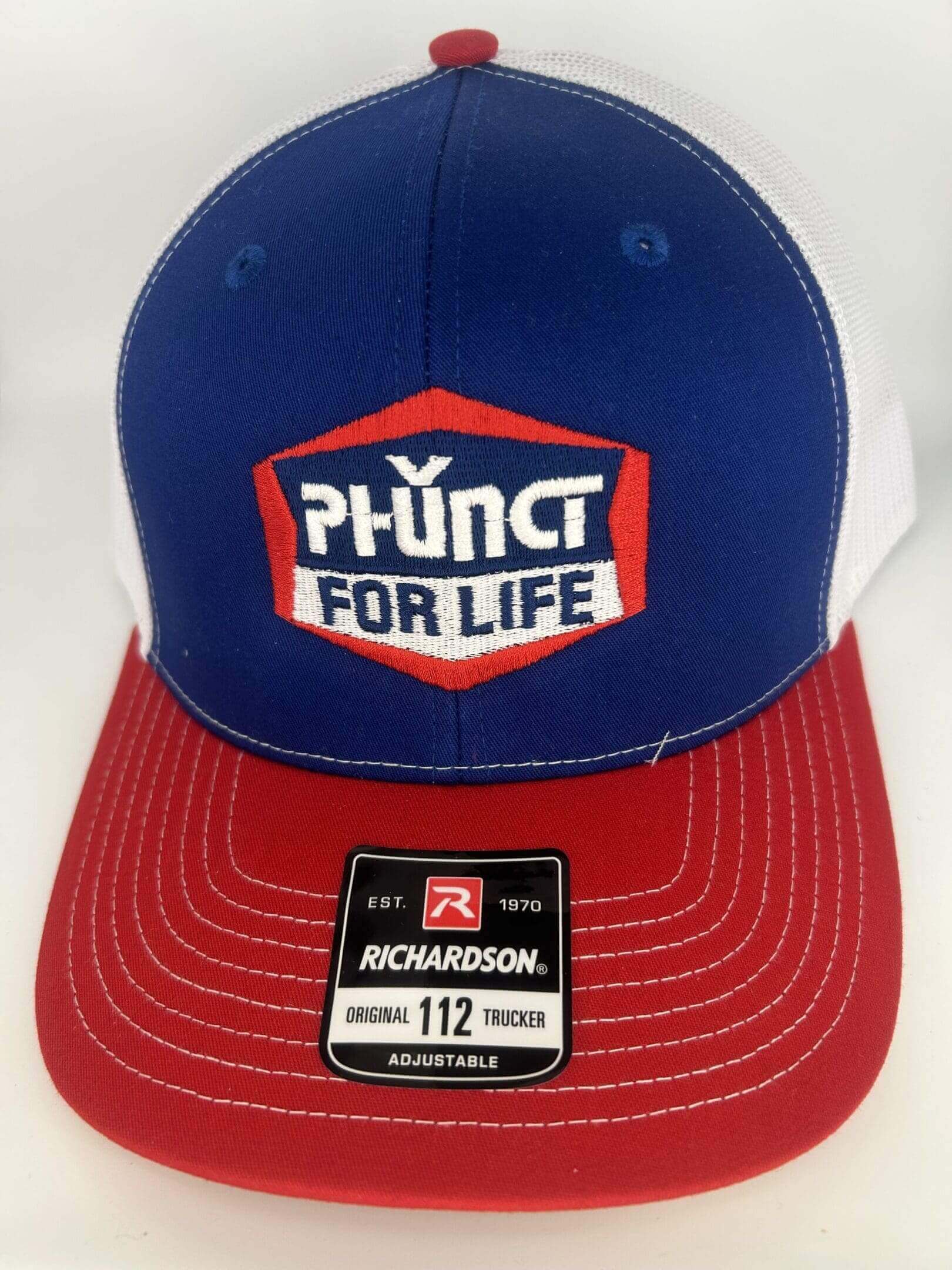 TRUCKER HAT (ONE SIZE FITS ALL)(FULLY ADJUSTABLE)PHUNCT FOR LIFE RED, WHITE AND BLUE