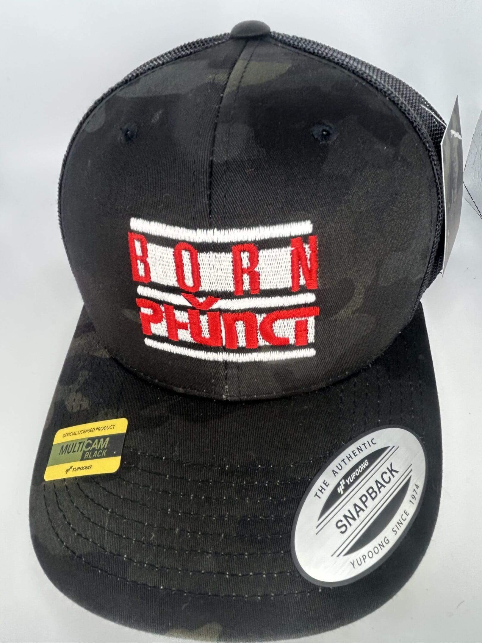 TRUCKER HAT (ONE SIZE FITS ALL)(FULLY ADJUSTABLE)BORN PHUNCT, BLACK CAMO
