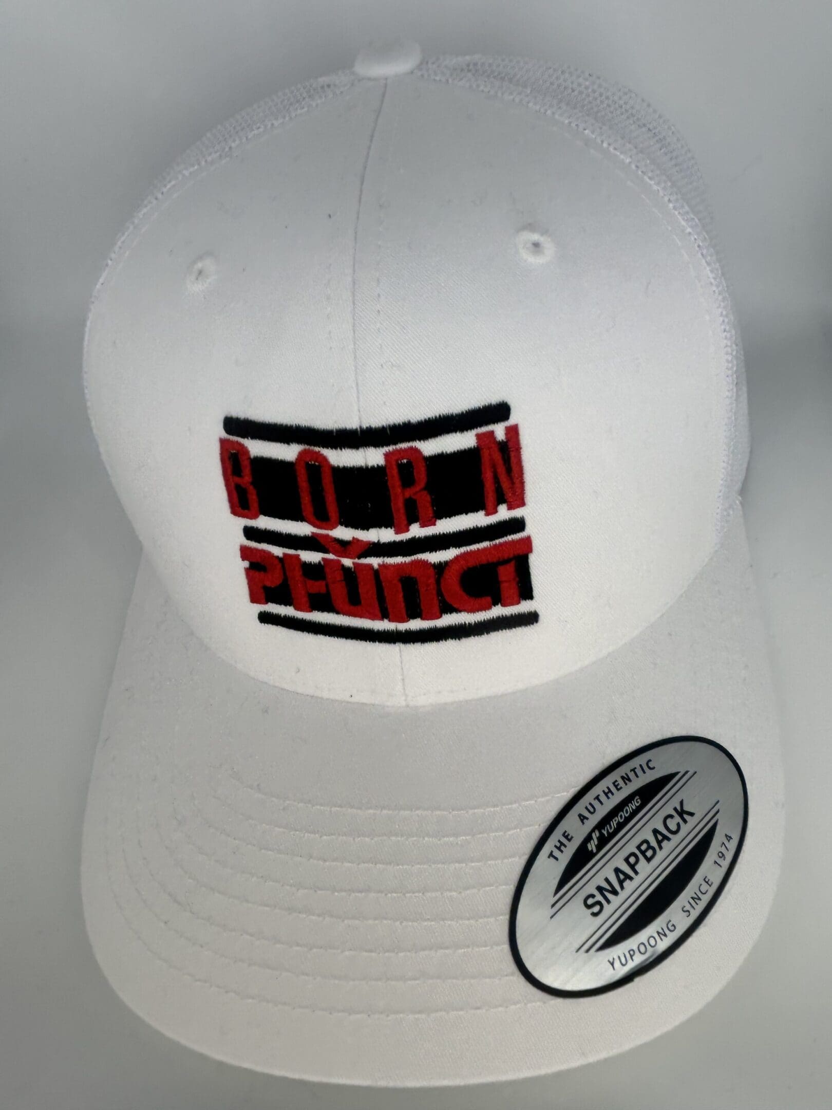 TRUCKER HAT (ONE SIZE FITS ALL)(FULLY ADJUSTABLE)BORN PHUNCT, WHITE