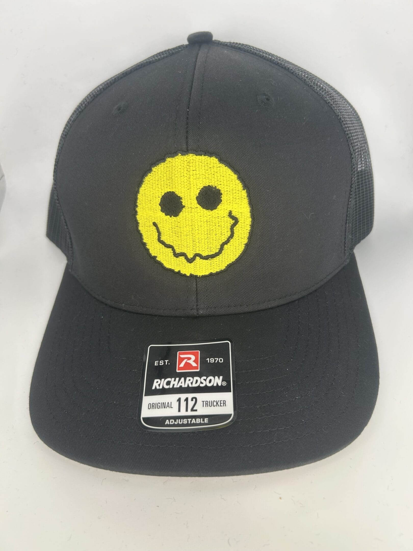 TRUCKER HAT (ONE SIZE FITS ALL)(FULLY ADJUSTABLE)HAPPY FACE, BLACK